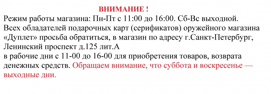 Всех обладателей подарочных карт (серификатов) оружейного магазина «Дуплет» просьба обратиться, в магазин по адресу