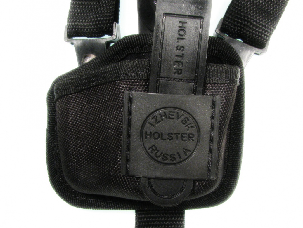 Наплечная кобура горизонтального расположения отлично крепится двумя ушками на корпусе за подвесную систему. Положенный внутрь пистолет застегивается на ремешок с кнопкой.