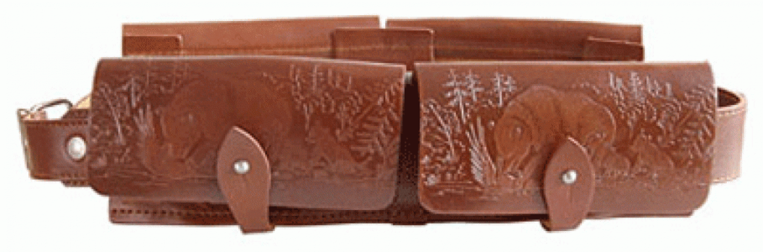 Патронташ универсальный на 24 патрона 12 калибр выполнен из натуральной кожи и предназначен для переноски патронов для охотничьего оружия во время охоты. Патронташ комплектуется двумя сдвоенными подсумками с карманами под 12 патронов 12 калибра каждый с отдельными клапанами. Подсумки снимаются и могут быть использованы как отдельные патронташи на 12 патронов. Для изменения длины патронташа предусмотрена регулировка на ремне.