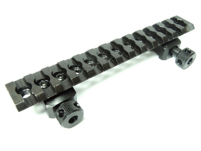 База имеет возможность перестановки стоек с шагом 10 мм для установки на оружие и регулировку выноса базы по направлению.