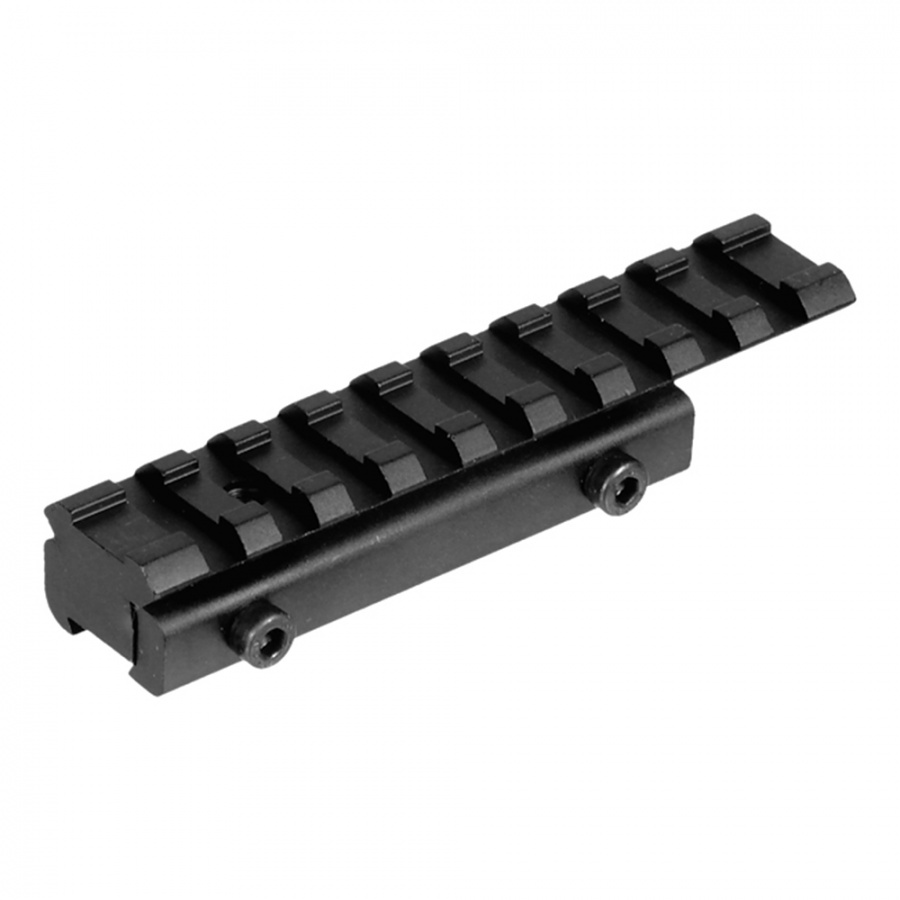 Адаптер для перехода с призмы 11-12 мм. на Weaver / Picatinny. Девять поперечных слотов для установки кронштейна. Высота между полками 13 мм. Длина установочной части на «ласточку» - 75 мм, длина верхней планки Weaver / Picatinny – 100 мм.