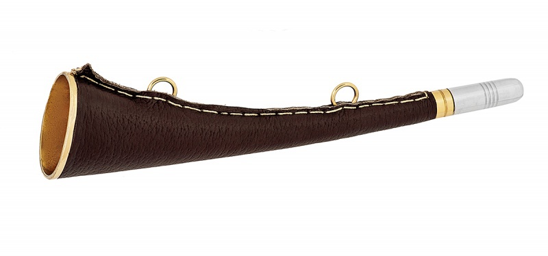 Горн длиной 25 см из латуни с мундштуком предназначен для подзыва охотничьей собаки. Встроенный пищик освобождает от необходимости учиться правильно извлекать звук. Каждый охотничий рог имеет индивидуальный тон.