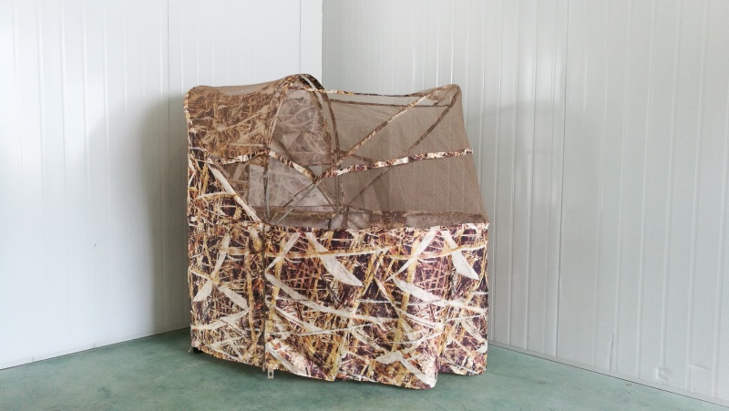 Засидка оборудована сдвижной крышей над головой, стропами для установки дополнительной маскировки из местной растительности, колышками для дополнительного крепления и чехлом. Материал кресла плотностью 600D, тента 300D.