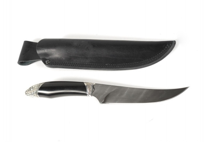 Навершие рукояти в виде змеиной головы, выполнено из бронзы. Деревянная часть сделана из черного дерева. Клинок ручной ковки изготовлен по технологии дамасских сталей, из многослойного металла путем горновой сварки. Комплектуется кожаными ножнами, паспортом и подарочной упаковкой.
