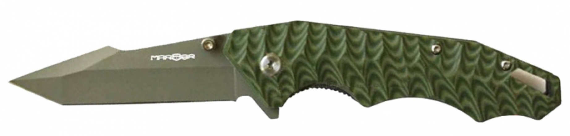 Складной нож с агрессивными чертами в дизайне. Интересный клинок типа Tanto с фальшлезвием великолепно дополняется рукоятью из G10 защитного цвета. Оригинальная текстура рукояти не только придает ножу уникальный облик, но и обеспечивает цепкость при удержании ножа.
