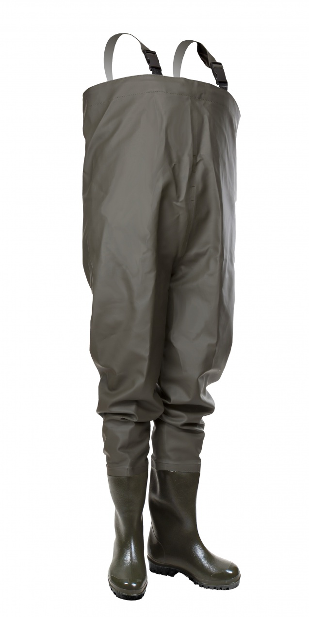 Полукомбинезон с завышенной спинкой, регулируемыми по длине лямками, удобным внутренним карманом. Полукомбинезон изготовлен из водонепроницаемого материала (трикотажного полотна, пропитанного ПВХ) и приварен к укороченным сапогам.
