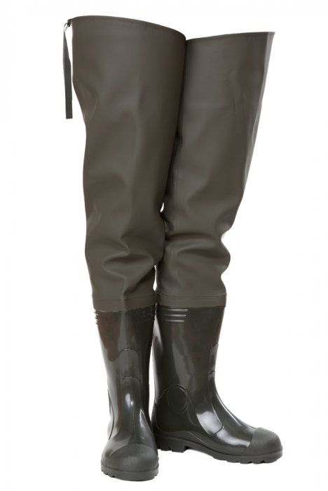 Сапоги рыбацкие на основе укороченных сапог. Надставка из водонепроницаемого материала. Верхняя часть сапога крепится к ремню брюк при помощи ремешка.