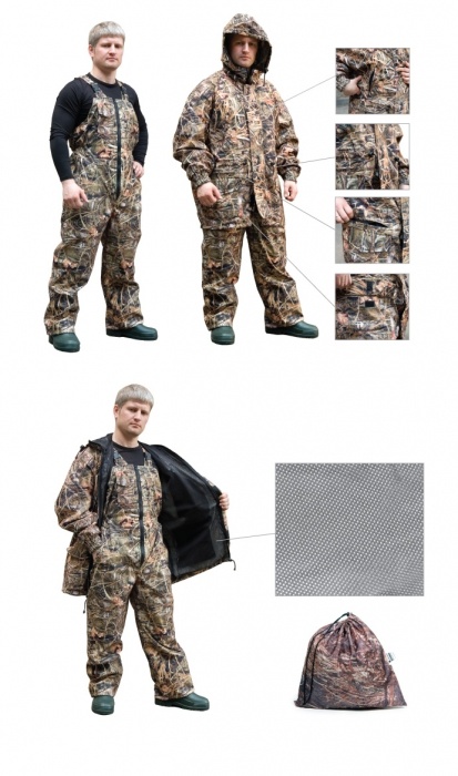 Костюм всесезонный Tagrider Defender для рыболовов, туристов, охотников, яхтсменов. Куртка с семью карманами. Внутренний карман, два кармана «кенгуру» (на молниях), два нaклaдных кармана снизу (c клапанами) и два вшивных кармана (c молниями) над клапанами накладных карманов. Молния «трактор» двухсторонняя повышенной прочности, закрытая от продувания и попадания влаги клапаном на липучках. Капюшон выполнен по финскому крою и при затягивании не налезает на глаза. На рукавах выполнены манжеты. На поясе и по нижнему краю куртки расположены затяжки сo стопорами. Спинка и грудь куртки сшиты без «кокеток», то есть без дополнительного горизонтального шва на груди и спине, который пропускал бы влагу, что делает куртку более влагозащищённой. Подкладка сетчатая не препятствует паропроницаемости наружного материала. Полукомбинезон с четырьмя карманами. На груди для рации или телефона (c клапаном) и для документов (на молнии) a так же два боковых кармана (на молниях). Высокая грудь и спинка полукомбинезона создают дополнительный комфорт и соединяются лямками на резинке, оснащенными фастексами. Молния на полукомбинезоне «трактор» повышенной прочности. Подкладка сетчатая не препятствует паропроницаемости наружного материала.