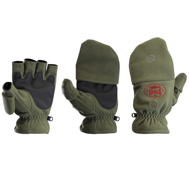 Перчатки-варежки с застежкой «Велкро» (липучка) для фиксации откидного элемента изготовлены из флиса с функцией Wind Stopper. Эта модель может быть использована как с закрытыми, так и с открытыми пальцами. Внутренняя сторона (ладони) дублирована непромокаемым материалом, который не дает перчатке намокнуть, даже если Вы берете рыбу в руки, не снимая перчаток.