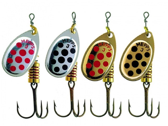 На лепестки MEPPS AGLIA DECOREE нанесены красные и черные точки. Опытные рыболовы, признавая полезность этой окраски, разделяются во мнениях о причинах ее эффективности. Одни считают, что точки на лепестке повышают контрастность окраски, тем самым провоцируя атаку рыбы. По их мнению, доказательством этого служит уловистость AGLIA DECOREE в мутной воде. Другие — наоборот придерживаются мнения, что эти же точки, при вращении сливаясь в мягкие линии, делают окраску спокойнее, что меньше настораживает рыбу и придает приманке внешность насекомого. Недаром MEPPS производит некрупные (№1, 2, 3) размеры данной модели. Лепестки AGLIA DECOREE имеют серебряную, золотую и медную окраски. Вы всегда имеете возможность подобрать наилучшую комбинацию для ваших условий. При вращении угол отклонения лепестка от оси составляет 60°.