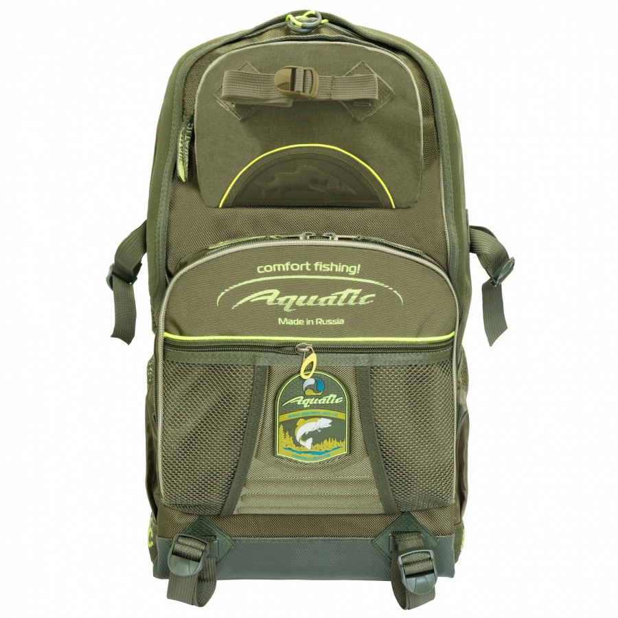 Самый популярный у рыбаков рюкзак Aquatic объёмом 40 литров изготавливается из качественных непромокаемых материалов. Состоит из основного отделения, защищенного от влаги неопреновой лентой, и 5 наружных карманов разной функциональности. На рюкзаке возможно закрепить габаритные вещи: тубус, туристический коврик, теплые вещи и прочее. Рюкзак имеет грудную регулировку и уплотненную спинку.