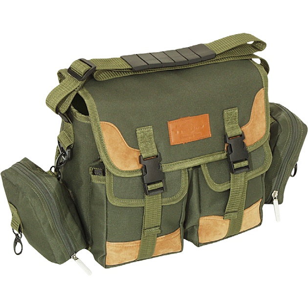 Рыболовная сумка с обшитым мягкой тканью внутренним пространством и съемным разделителем основного отсека. 2 объемных фронтальных кармашка, 2 отстегивающихся объемных боковых кармана-пенала, которые можно использовать отдельно от основной сумки. Переносится на наплечном ремне.