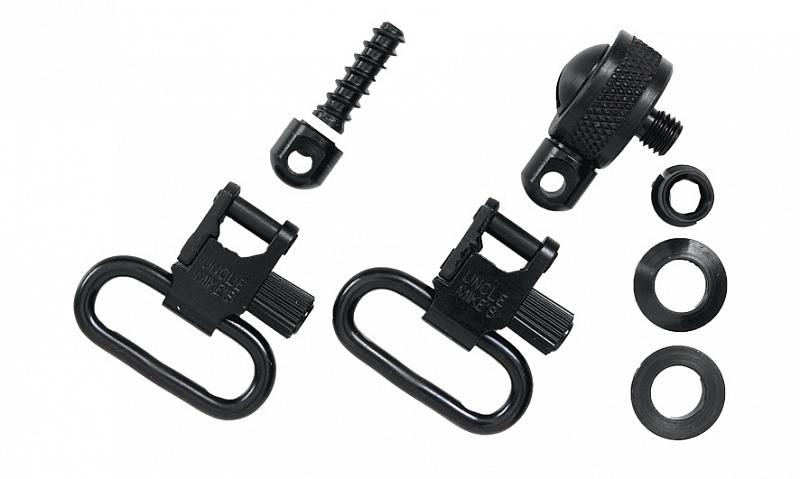 Комплект антабок быстросьемных Uncle Mike`s QD115 SG-2 для помповых ружей и полуавтоматов, 15612. В комплекте две антабки, шуруп длиной 19 мм (3/4") со штырем, поворотная втулка со штырем для установки на крышку подствольного магазина, гайка, две шайбы и пластиковая прокладка.
